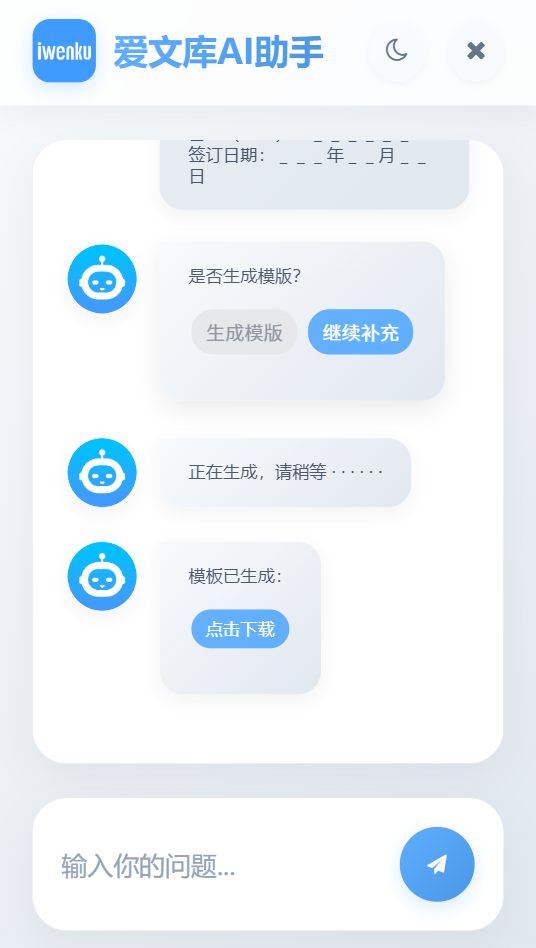 6、根据您的需求,对话更改生成新的内容,如:“甲方名字是张三”,“去掉第六条条款”等,完成后点击下载模版