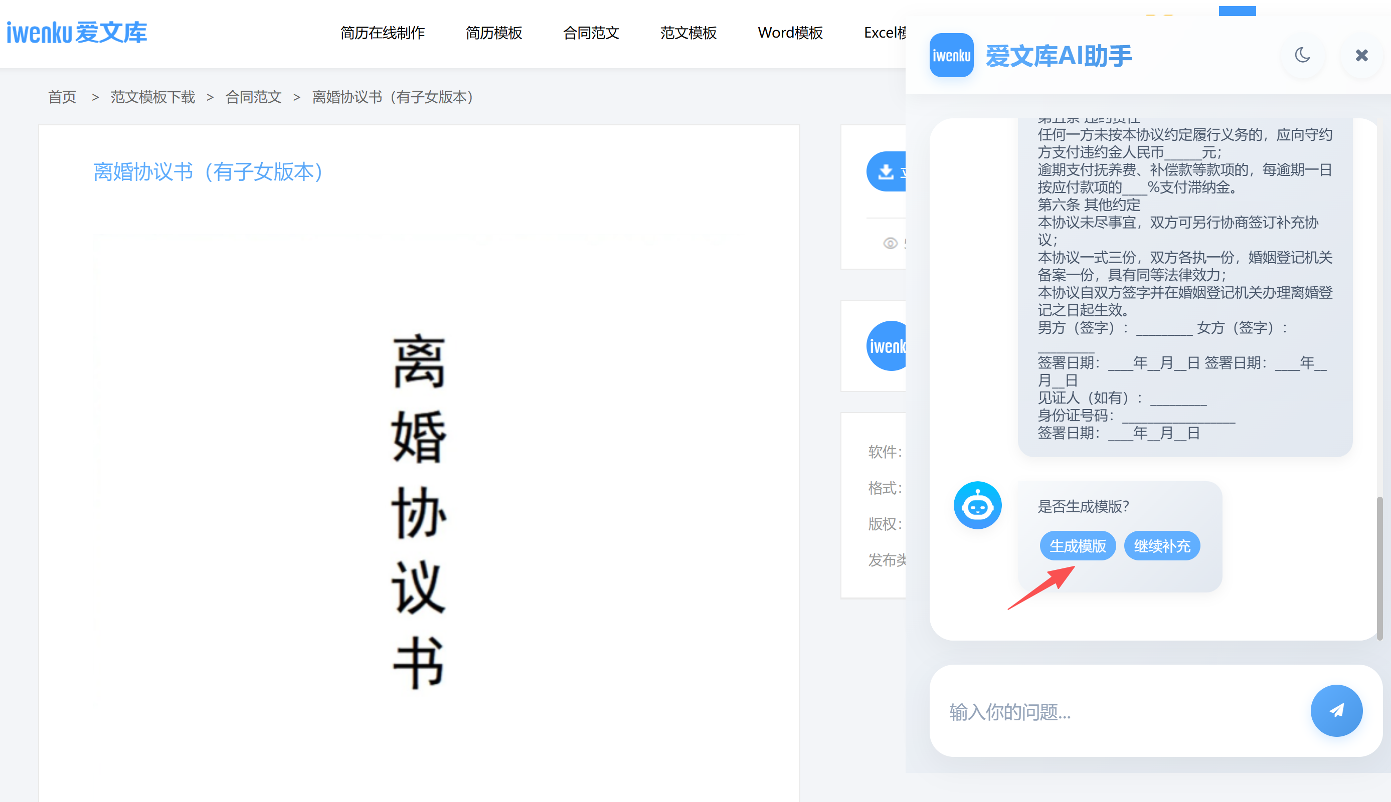 5、根据您的需求,对话更改生成新的内容,如:“甲方名字是张三”,“去掉第六条条款”等,完成后点击下载模版